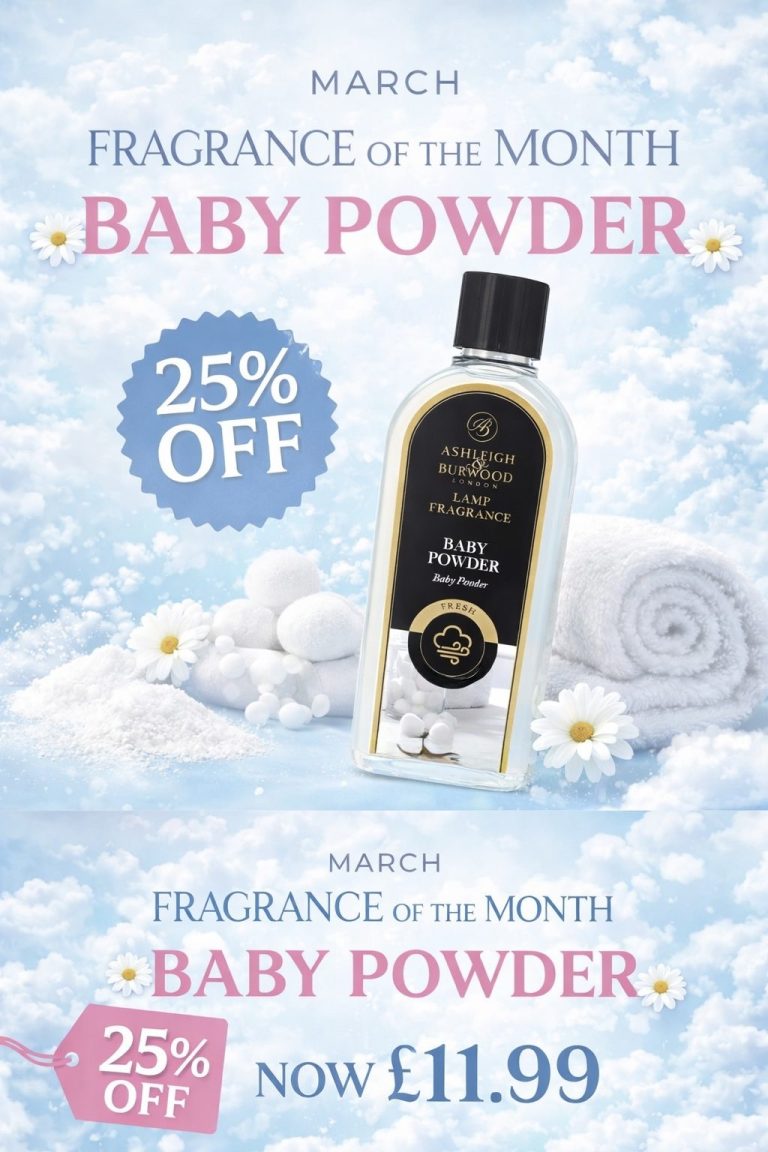 Our Fragrance of the Month for March is the beautifully comforting Baby Powder Lamp Fragrance.